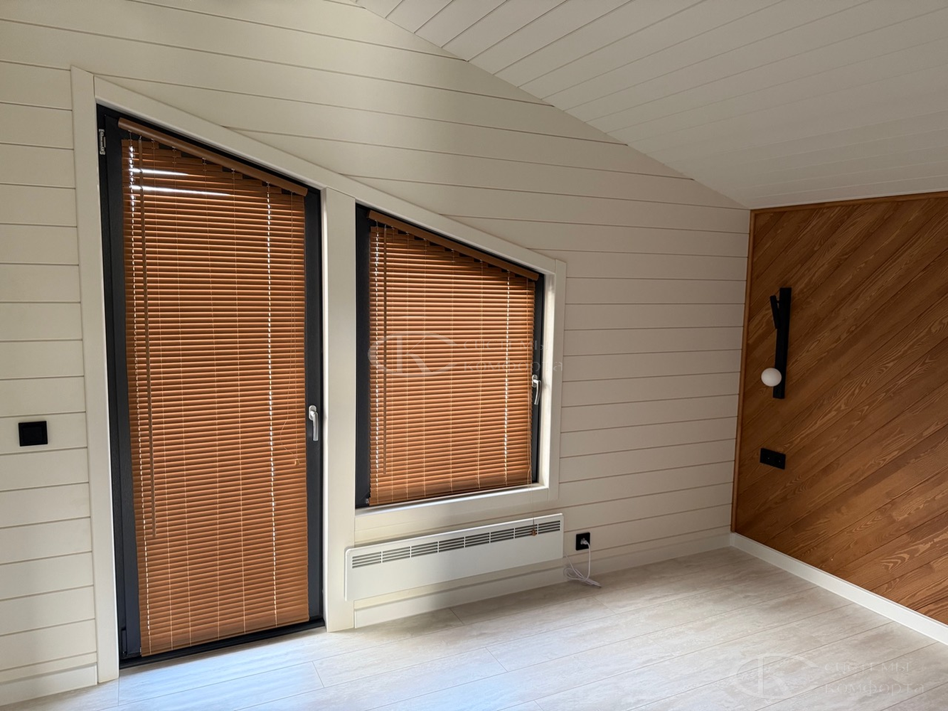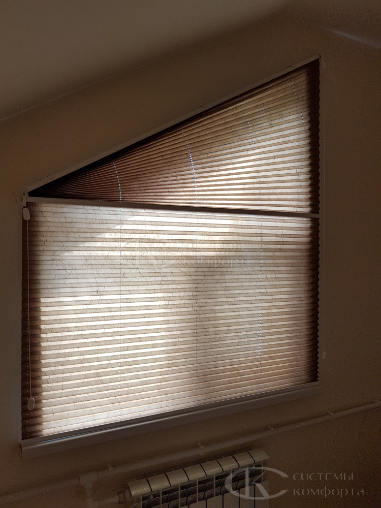 Компания «Системы комфорта» изготавливает жалюзи на треугольные окна и на другие проемы нестандартной формы по индивидуальному заказу. Чаще всего они встречаются в мансарде: окно треугольной формы размещается на фронтоне и помогает обеспечить естественное освещение подкровельного пространства. Однако и в других помещениях могут быть оконные проемы необычной формы, для которых необходимо изготовить персональные системы управления светом.